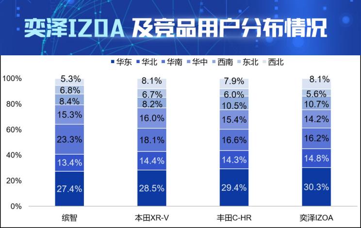 从用户下单数据来看,奕泽IZOA及其竞品用户主要集中在华东、华南地区。奕泽IZOA用户量Top 3省份分别为广东、江苏、山东,Top 3城市分别为北京、天津、广州;丰田C-HR用户量Top 3省份分别为广东、浙江、江苏,Top 3城市分别为北京、上海、东莞;本田XR-V用户量Top 3省份分别为广东、山东、湖北,Top 3城市分别为北京、武汉、西安;缤智用户量Top 3省份分别为广东、山东、河北,Top 3城市分别为东莞、广州、北京。奕泽IZOA与其竞品用户来自广东、山东、江苏等省份的最多。竞品圈各车系在北京、东莞、广州等城市的市场争夺最为激烈。
