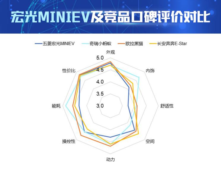 在竞品圈中,今年市场销量排名第3的欧拉黑猫,用户口碑总体评分为4.56,在竞品圈中总体评分最高,在这里市场销量与用户口碑有所背离。从用户评价来看,欧拉黑猫在外观、性价比方面用户评价较好,但在舒适性、内饰方面有待提升。小蚂蚁口碑总体评分为4.55,位居口碑总体评分第二名,与欧拉黑猫相比,口碑总体评分差距不大,其在能耗、性价比方面较受用户青睐,但在舒适性、空间方面评价一般,如在这些方面进行提升的话,有望获取更多用户。奔奔E-Star用户口碑排名第三,在舒适性、内饰方面有一定劣势,需要进行提升以提高用户满意度。宏光MINIEV用户评分最低,对舒适性、内饰用户有较多不满,需优化产品,满足用户需求,提升产品竞争力。