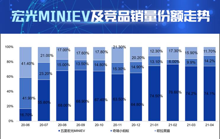 2021年4月, 宏光MINIEV销售2.93万辆,相较上月下降26.4%;年1-4月累计销量为12.59万辆。纵观整体微型车市场,今年4月及1-4月累计销量同比增长率分别为471.6%和802.8%,4月单月销量表现强劲,依旧获得新能源车销量冠军,累计销量表现也十分亮眼。