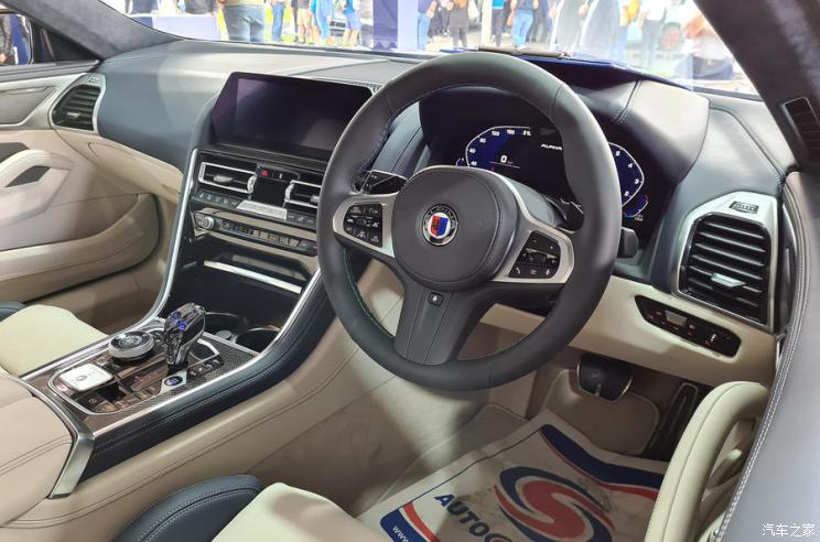 新车内饰也基本保留了宝马8系Gran Coupe版的设计,全液晶仪表盘搭配三辐式多功能运动方向盘,悬浮式设计的中央多媒体显示屏搭配水晶挡把 ,内饰中还充满了木饰、皮革和Alcantara材质的装饰面板,增强其豪华感。此外,新车在换挡区域附近增加了一个“BMW ALPINA B8”的特殊铭牌,以展现其特殊的身份。