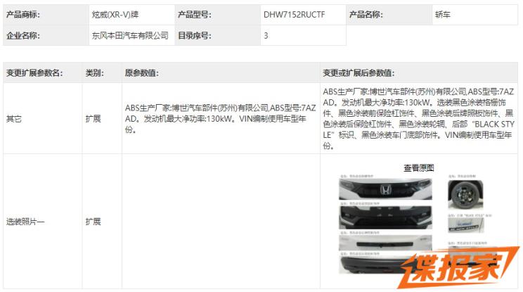[本站 国内谍照] 日前,我们从工信部官网获取了一组本田XR-V Black Style套件版车型的申报图信息。新车将在外观方面有一些变化,动力部分将使用1.5T涡轮增压发动机。