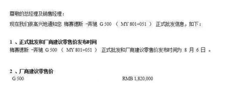 [本站 资讯] 近日,我们从相关渠道获取到了一个新款奔驰G 500车型的疑似售价,为182.00万元。目前,奔驰G级在售车型为两款,一款是G 350车型,售价为142.98万元;另一款为G 500炽炎特别版车型,售价为212.7万元。