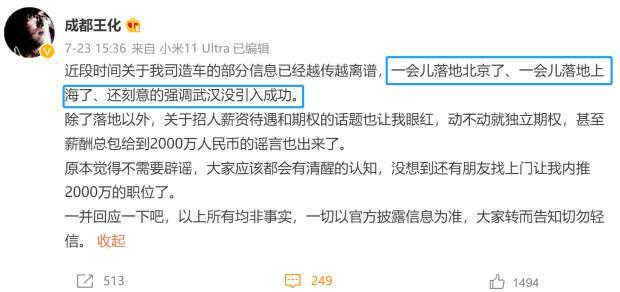 目前,对于小米汽车到底落户哪里、将采用何种方式生产等问题有诸多传言,7月23日,小米公关部总经理王化在微博称“一切以官方披露信息为准,大家转而告知切勿轻信。”但很明显的是,小米的造车计划正在如火如荼地进行,7月28日,雷军通过微博发出招聘信息,称小米汽车自动驾驶诚邀500名技术精英,足见其造车的决心。关于小米造车的更多消息,我们也将持续关注。