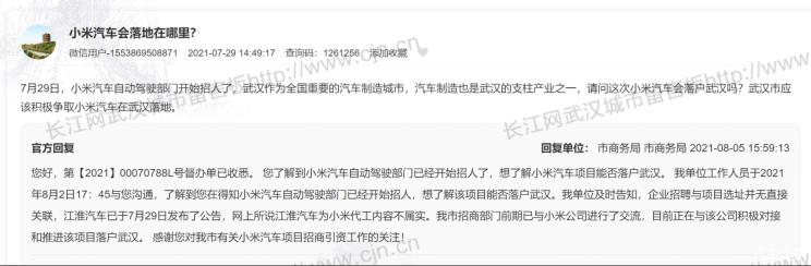通过截图能够看到,该用户于7月29日提问称,“7月29日,小米汽车自动驾驶部门开始招人了,武汉作为全国重要的汽车制造城市,汽车制造也是武汉的支柱产业之一,请问这次小米汽车会落户武汉吗?”武汉市商务局回答称,“我单位及时告知,企业招聘与项目选址并无直接关联,江淮汽车已于7月29日发布了公告,网上所说江淮汽车为小米代工内容不属实。我市招商部门前期已与小米公司进行了交流,目前正在与该公司积极对接和推进该项目落户武汉。 感谢您对我市有关小米汽车项目招商引资工作的关注!”
