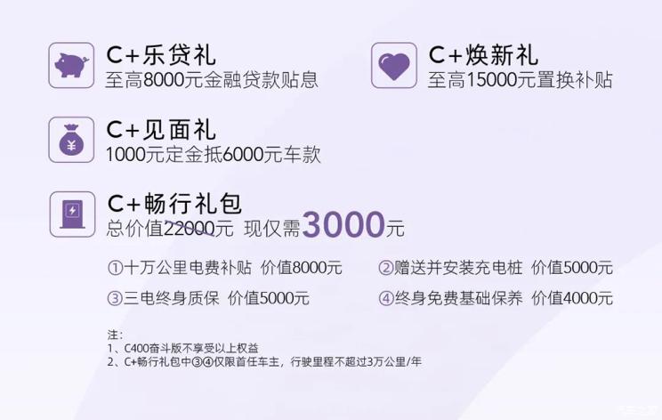 购车政策方面,几何C为消费者提供了多重礼遇,比如至高8000元的金融贷款贴息、至高15000元的置换补贴、1000元定金抵6000元车款、价值3000元的“C+畅行礼包”等。