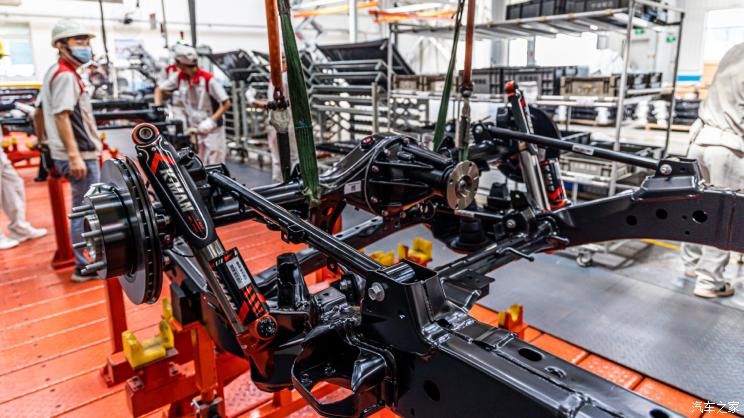 来到车侧,新车将会在轮眉以处配备风格更加激进的黑色护板,同时,宽大的侧裙金属踏板与轮眉护板紧密连接,营造出更加硬朗的整体视觉感受。同时,踏板上还将采用复杂的纹路设计,能够起到更好的防滑作用。此外,新车还将配备一款由运良和科曼联合定制开发的避震器,能够大大提升车辆在崎岖路段的表现,同时,这款避震器还支持压缩阻尼可调功能,用户可以在驾驶时将阻尼调整至相对应的档位。