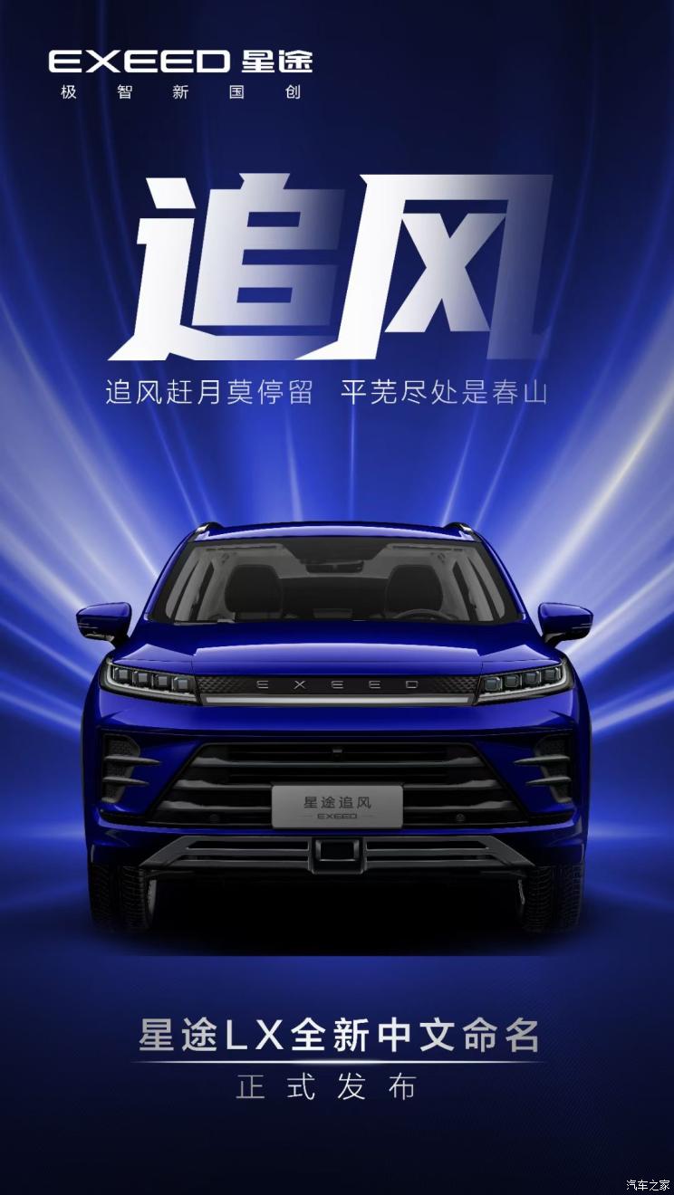 [本站 资讯] 8月26日,星途官方正式公布旗下星途LX全新中文名称――追风。这也是继揽月、凌云之后,星途第三款以中文名称命名的产品,其继续定位于一款紧凑型SUV。