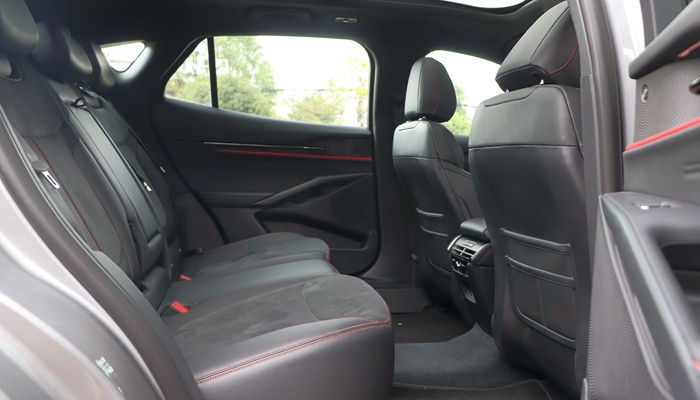 由于优秀的车身尺寸,福特EVOS的后排空间算是个免检项,哪怕用了压抑头部空间的溜背造型,在没做偷空的情况下后排头部表现还是可以的。另外像实测43cm的腿部空间,宽大柔软、支撑到位的座椅、可调的靠背、几乎纯平的地台(试驾车还有后排座椅加热),坐在这台车的后排是能称得上舒适、惬意的。