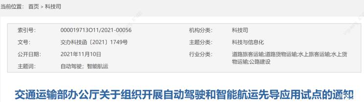 [本站 资讯] 近日,交通运输部办公厅发布了《关于组织开展自动驾驶和智能航运先导应用试点的通知》,提出要在自动驾驶、智能航运等领域开展试点任务,全文如下: