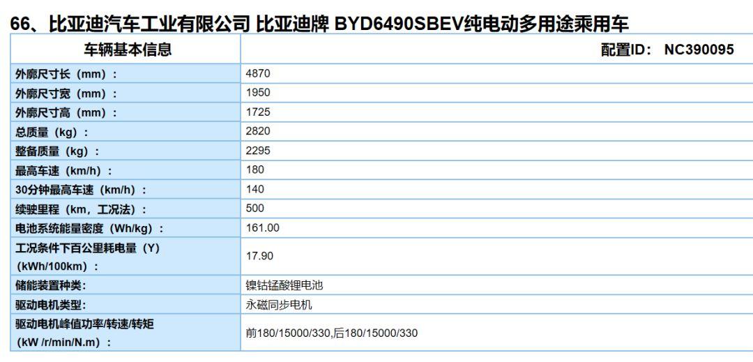 从此次公示的信息来看,比亚迪唐纯电版的长宽高分别为4870/1950/1725毫米,轴距为2820毫米,与唐DM尺寸完全一致,比燃油版唐宽了10毫米,高了5毫米。根据申报信息,唐纯电版未来将提供5座和7座版本车型。