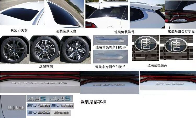 配置方面,比亚迪唐纯电版可选装小窗、全景天窗、侧装饰件和轮毂等配置。通过唐纯电版尾标可选装“4.3s”和“4.4s”可推断,该车将会推出两个性能版本。“4.3s”是一个极速版的概念,和现在的唐DM创世版类似。