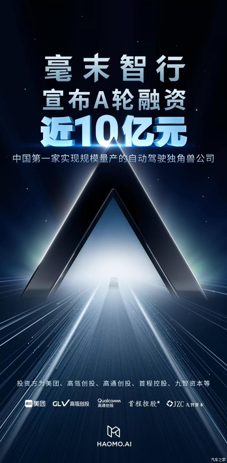 [本站 资讯] 今日(12月22日),毫末智行宣布获得A轮融资近10亿元,成为中国第一家实现规模量产的自动驾驶独角兽公司(独角兽公司:投资界术语,一般指成立不超过10年,估值要超过10亿美元,少部分估值超过100亿美元的企业。)。投资方为美团、高瓴创投、高通创投、首程控股、九智资本等。募得资金将主要用于自动驾驶研发投入和人才体系建设。