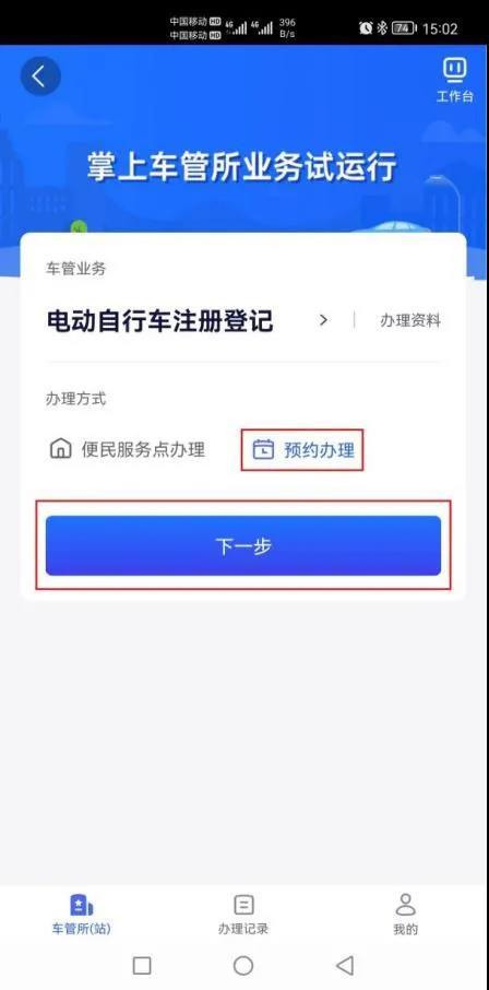 再点击“电动自行车业务”,选择“电动自行车注册登记”选择预约办理,点击下一步。