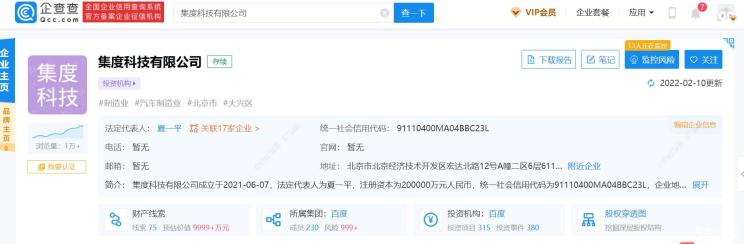 企查查显示,集度科技有限公司于2021年6月7日注册成立,法定代表人夏一平,注册资本30952.57万美元,注册地址为北京自贸试验区高端产业片区亦庄组团亦庄创新大厦。经营范围包括新能源汽车整车及相关零部件的技术服务、汽车零部件及配件制造、销售新能源汽车等。此外,集度汽车有限公司的注册地点为上海市嘉定区汇荣路468号,集度在北京和上海形成双总部战略。