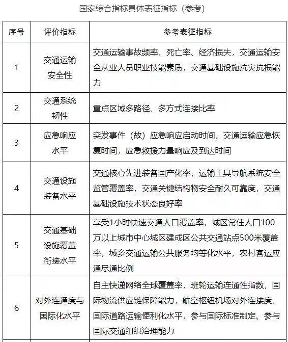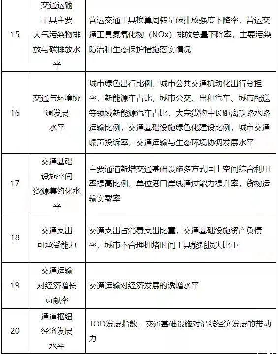 综合考虑各地区、各行业特点,注重交通运输与经济社会、生态环境相协调,统筹发展和安全,围绕“安全、便捷、高效、绿色、经济”,从“基本特征、评价维度、评价指标”三级设置20项评价指标。相应设置部分表征指标,供行业、地方制定指标参考,具体见附件。