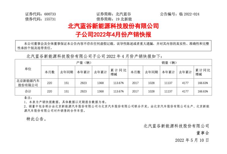 今年4月,北汽新能源实现汽车产量220辆,实现销量2017辆。1-4月,北汽新能源累计实现汽车产量2923辆,同比增长113.67%;累计实现销量1.11万辆,同比增长166.63%。