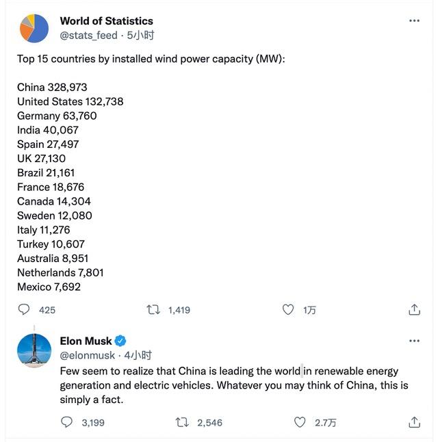 不久前,海外社交平台用户World of Statistics发布了一份“全球风电装机量前15名榜单”,榜单显示,中国以328973兆瓦高居榜首,而排在第二名的美国为132738兆瓦,还不到中国的一半。马斯克在推文下留言称,中国在可再生能源发电和电动汽车方面领先世界。