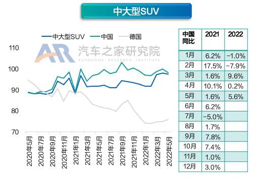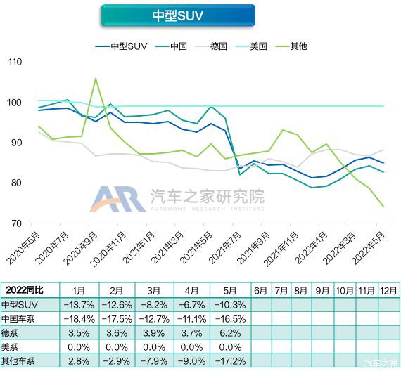 5月,中型SUV市场的价格指数为97.57,同比增长6.30%,环比下降0.46%。分国别看,美系(+1.8%)、德系(+1.4%)上涨,中国车系(-1.7%)下跌。细分市场的整体均价为32.35万元;中国车系29.72万元、德系39.10万元、美系37.05万元。其中,主要涨价车系为Mustang Mach-E(+4.1%),主要降价车系为AION LX(-9.2%)、威马W6(-5.0%)。
