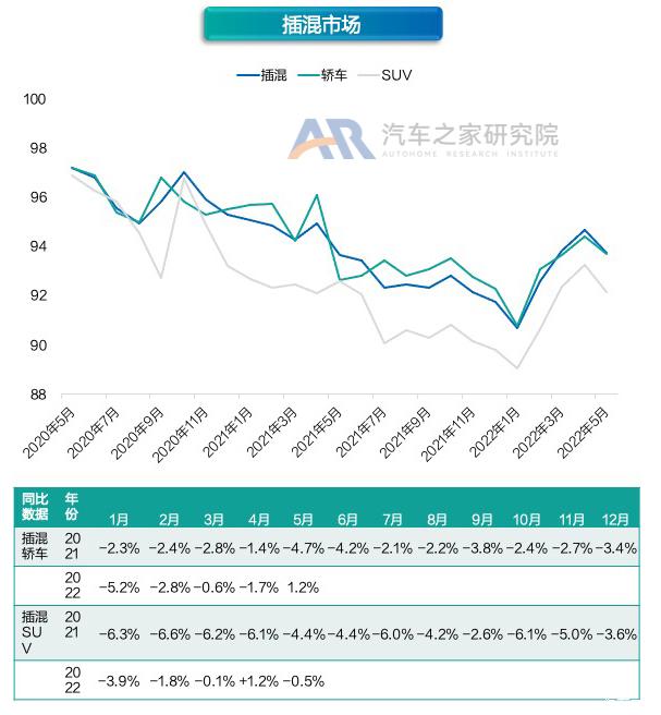 3、插电式混合动力市场(含增程式)的价格指数为93.73,同比增长0.07%,环比下滑1.01%。;