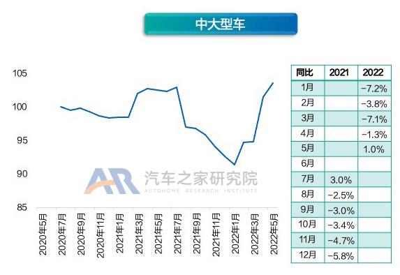 5月,中大型轿车市场的价格指数为103.59,同比增长0.99%,环比增长2.10%。细分市场整体均价为29.35万元,较去年同期涨4.0万元,较上月涨6000元。其中,涨价车系为极狐 阿尔法S(ARCFOX αS)(+22.8%)、蔚来ET7(+3.5%)、ZEEKR 001(+1.6%)、汉(+1.1%)。