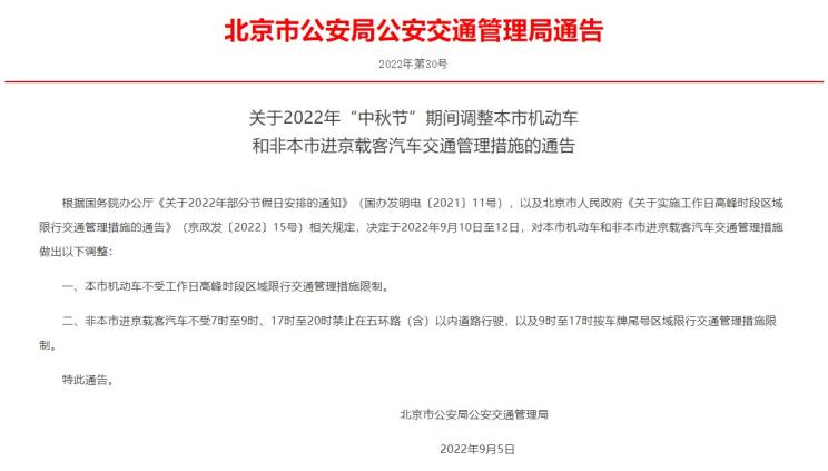 [本站 资讯] 近日,北京市公安局公安交通管理局发布公告,关于2022年“中秋节”期间调整本市机动车和非本市进京载客汽车交通管理措施的通告根据国务院办公厅《关于2022年部分节假日安排的通知》(国办发明电〔2021〕11号),以及北京市人民政府《关于实施工作日高峰时段区域限行交通管理措施的通告》(京政发〔2022〕15号)相关规定,决定于2022年9月10日至12日,对本市机动车和非本市进京载客汽车交通管理措施做出以下调整: