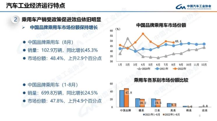 8月,国内品牌生产的高端品牌乘用车销量为35.1万辆,同比增43.5%,1-8月销量为237.3万辆,同比增长6.6%。中国品牌乘用车8月销售102.9万辆,同比增长45.3%。市场份额为48.4%,上升2.9个百分点。新能源车8月产销分别为69.1万辆和66.6万辆,月度产销创历史新高,纯电车产销分别为53.6万辆和52.2万辆,插混车产销15.5万辆和14.4万辆。