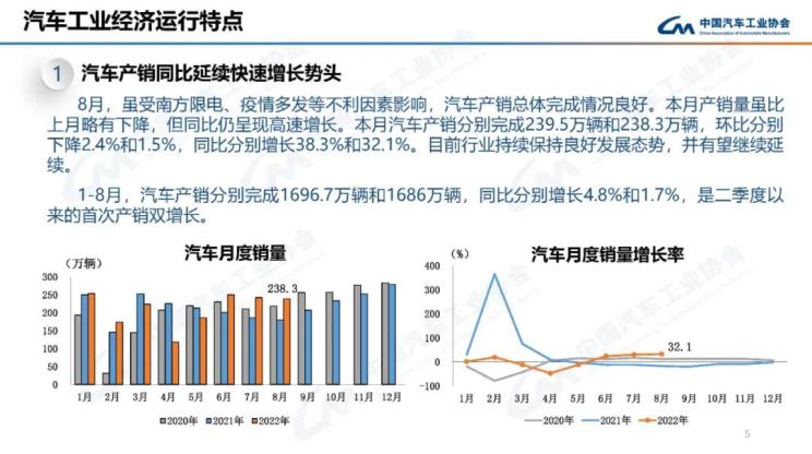 [本站 资讯] 9月9日,中汽协发布了8月汽车工业产销情况,2022年8月,汽车产销同比延续保持快速增长势头,购置税优惠等促消费政策持续发力,乘用车消费企稳上升,即使经济运行有波动,消费依然坚韧,已逐步恢复到正常状态;商用车产销实现今年以来首次同比增长;本月新能源汽车产销、汽车出口同比均创历史新高。