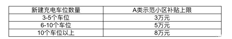 2. 支持共享充电示范小区建设。示范小区包括A类示范小区和B类示范小区。A类指利用小区自有车位新建共享充电设施的小区,原则上应是2005年前建成的小区,需符合三方面要求。一是规模性要求,充电设施应在小区扩建的停车位上建设,扩建的充电停车位应不低于3个。二是公共服务要求,充电停车位应采用分时共享智能有序调节模式。三是规范管理要求,由充电企业负责建设和运营管理,小区业主大会、物业服务企业应给予支持,并与充电企业签订三方协议,以明确三方责任义务。B类指利用小区周边300米以内充电设施共享充电的小区,小区与小区周边政府机关或企事业单位停车场签订车位错峰共享专属5年以上长期协议后,共享车位充电设施总量10个以上或新建充电设施5个以上的,可申报B类示范小区。2022年及之后建成经认定的A类示范小区,给予充电设备金额50%的财政资金补贴,与电网企业结算电价执行居民电价标准;对支持A类示范小区建设的小区业主大会给予一次性补贴(补贴标准详见下表)。