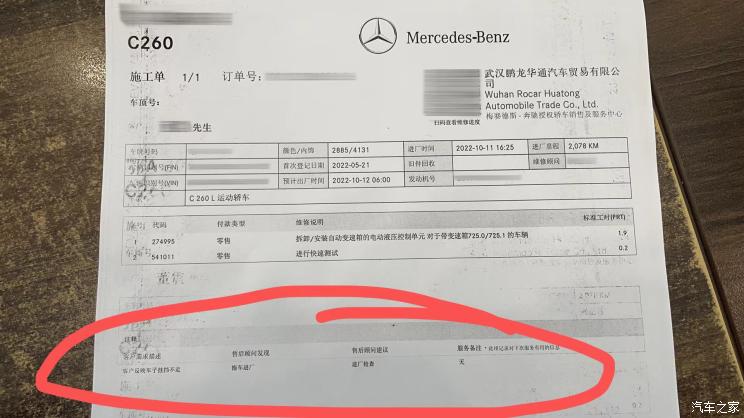 王女士今年5月19日在武汉鹏龙华通奔驰4S店购买了一台2022款奔驰C 260 L运动版 4MATIC,10月10日,王女士在正常驾车过程中,当时车速大约是40km/h,车辆变速箱突然自动跳至P挡,且之后无法再换挡,王女士称,故障发生后车辆没有任何异响和提示。随后王女士的爱车被拖至鹏龙华通4S店维修,但之后4S店始终无法确认问题点。在联系厂商技术支持后,厂商建议拆解变速箱部分配件进行检测,但仍未告知具体故障点和维修方案。
