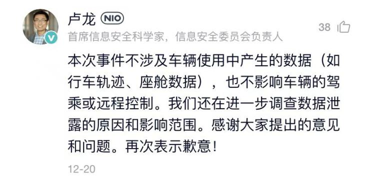 随后,蔚来首席信息安全科学家,信息安全委员会负责人卢龙表示,“本次事件不涉及车辆使用中产生的数据(如行车轨迹、座舱数据),也不影响车辆的驾乘或远程控制。我们还在进一步调查数据泄露的原因和影响范围。感谢大家提出的意见和问题。再次表示歉意。”