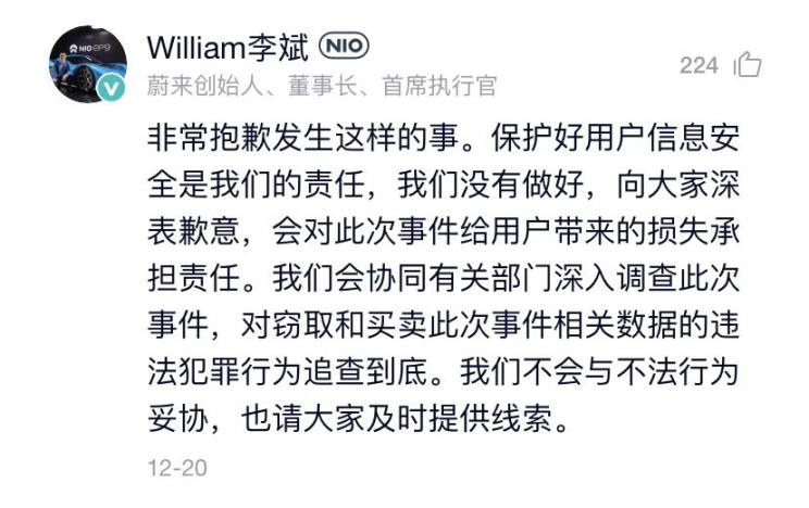 [本站 资讯]12月20日,蔚来用户数据遭不法人士泄露后,蔚来官方第一时间发出了致歉声明,随后,蔚来CEO李斌也在该声明下方评论区留言致歉。
