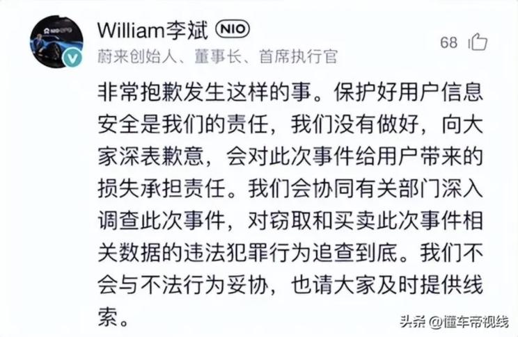 蔚来表示,收到勒索邮件后当天便成立了专项小组进行调查,并第一时间向有关监管部门报告。经初步调查,被窃取的数据为2021年8月之前的部分用户基本信息和车辆销售信息。蔚来表示对此次事件对用户造成的影响深表歉意,并承诺对用户造成的损失承担责任。蔚来将协同有关执法部门深入调查此事,并依法打击数据窃取、买卖行为。(信息/部分图片来源 懂车帝;编译/本站 郭辰)