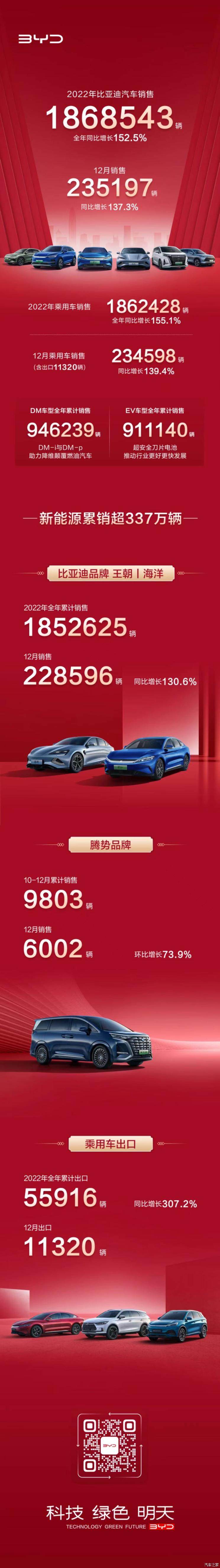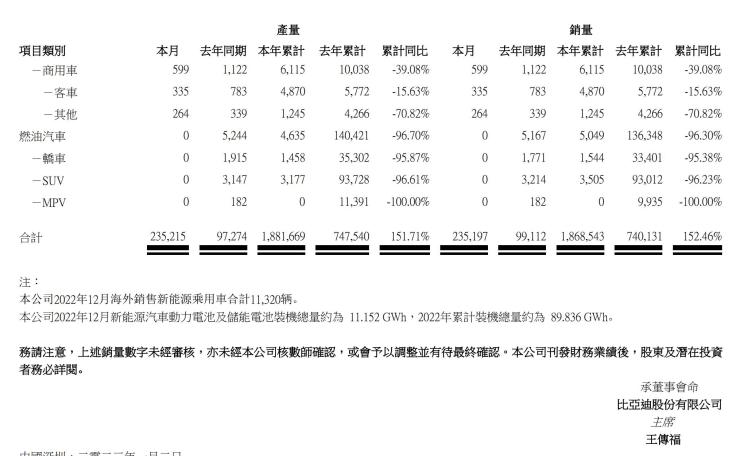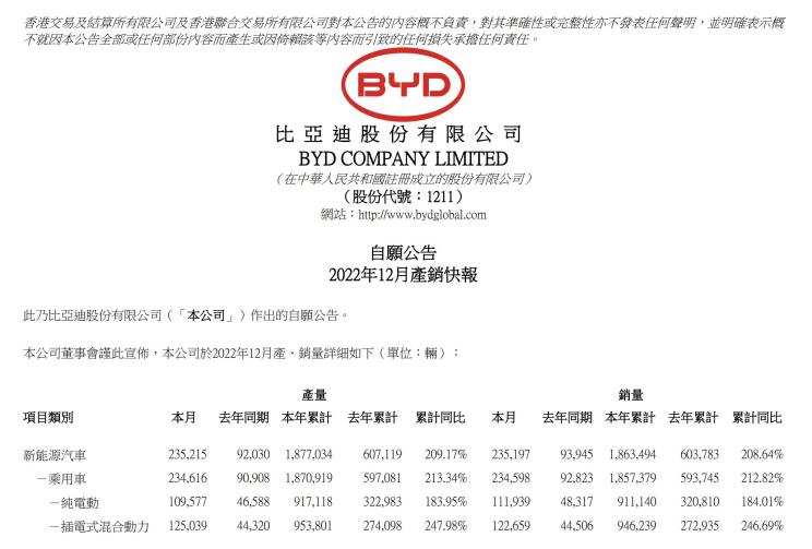 [本站 资讯] 比亚迪股份1月2日在港交所公告,2022年12月新能源汽车销量23.52万辆,上年同期9.39万辆;2022年累计销量186.35万辆,同比增长208.64%。12月新能源汽车动力电池及储能电池装机总量约为11.15GWh,2022年累计装机总量约为89.84GWh。