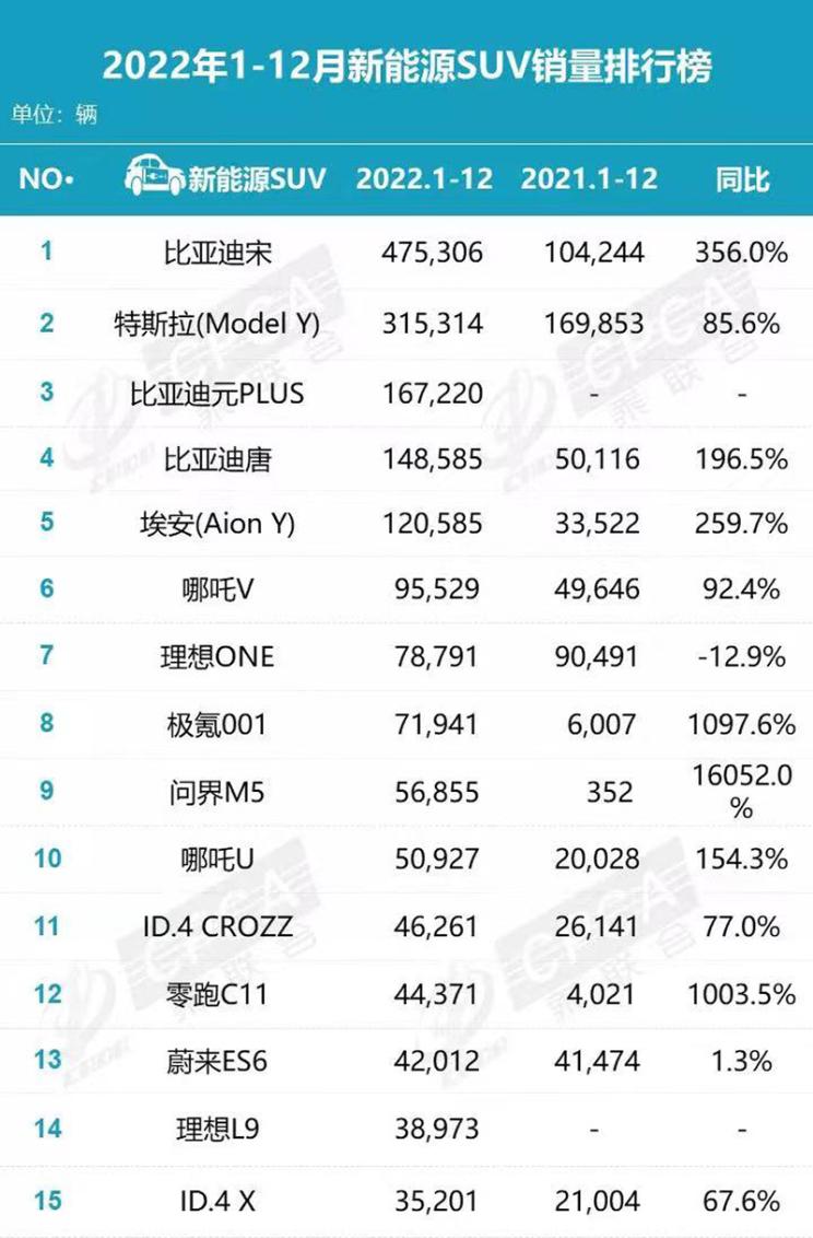 12月销量前三SUV分别为比亚迪宋、特斯拉Model Y、比亚迪元PLUS,销量分别为70269台、29387台、20862台。新车型中,极氪001销量11337台,理想L9销量10582台,理想L8销量10189台,问界M5销量6223台,smart精灵#1销量4606台,蔚来ES7销量4154台,小鹏G9销量4020台。全年累计销量前三名分别为比亚迪宋、特斯拉Model Y、比亚迪元PLUS,销量分别为475306台、315314台、157220台。其中极氪001、问界M5、零跑C11同比增长破百分之一千。