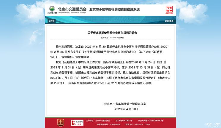 指标有效期截止日期在2023年9月1日(含)以后的小客车指标,按照《北京市小客车数量调控暂行规定》(市政府令第296号),应当自取得指标确认通知书之日起12个月内办理完成车辆登记手续。(编译/本站 周易)