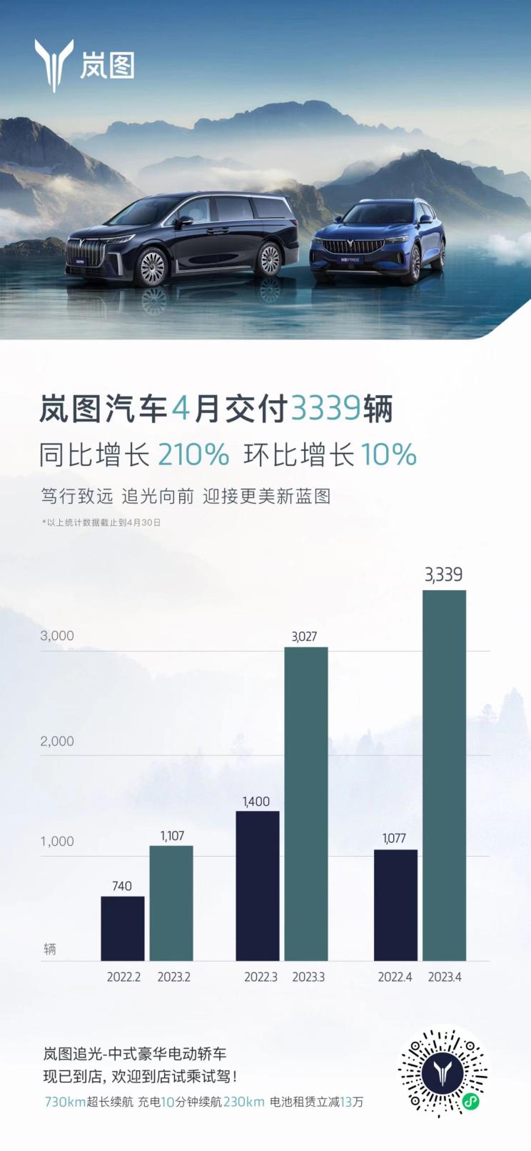 [本站 资讯]日前,岚图汽车公布4月交付数据,共计交付新车3339台,同比增长210%,2022年4月交付仅1077台;环比增长10%,2023年3月交付3027台。