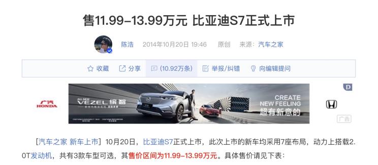 『2014年本站发布的比亚迪S7,评论盖到了10.92万层』