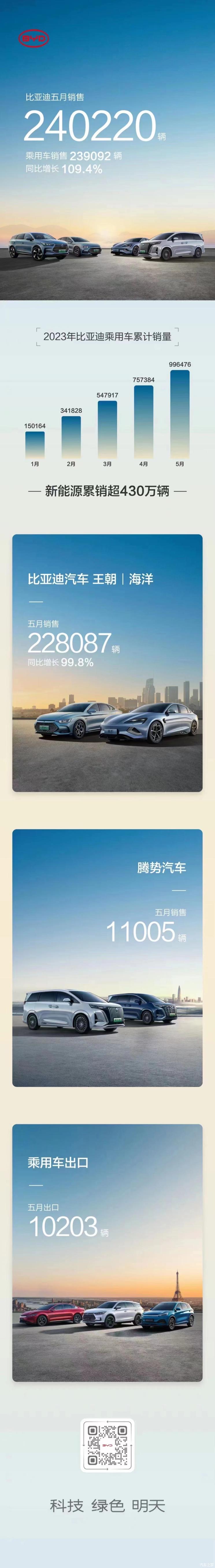 5月份比亚迪汽车出口达到10203台。今年1-5月,比亚迪乘用车销量已经达到996476台,接近百万台,而特斯拉2022年全球销量为131万台。新能源车累计销量超430万辆。