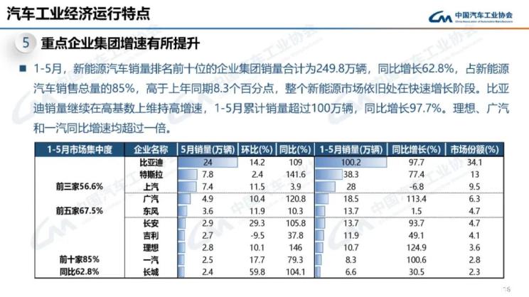 1-5月,汽车销量排名前十位的企业集团销量合计为883.9万辆,同比增长7.9%,占汽车销售总量的83.3%。在汽车销量排名前十位企业中,与上年同期相比,比亚迪、北汽、奇瑞、吉利销量增速明显,呈两位数增长;一汽、长安和广汽同比小幅增长,其他企业呈不同程度下降。