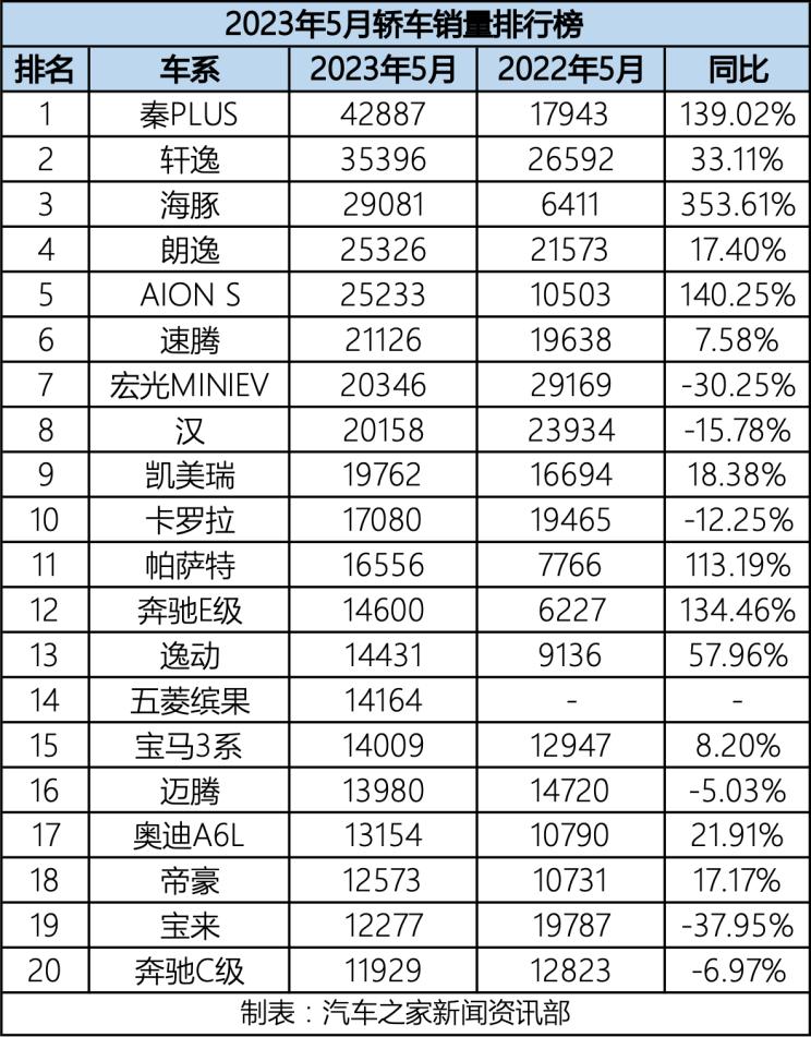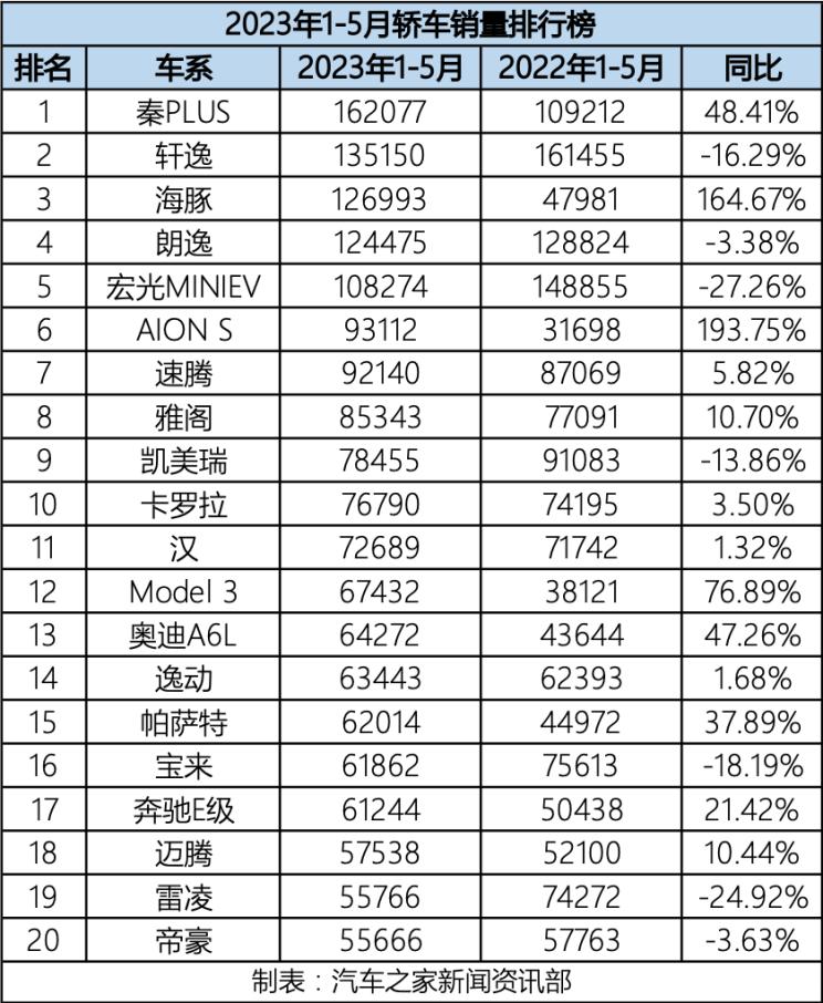具体来看,比亚迪秦家族依旧保持强势,稳定在月销4万+的水准,1-5月累计销量已经达到16.2万辆,与第二名的轩逸逐渐拉开了差距。值得一提的是,本田雅阁在5月份正式完成更新换代,也许是新老交替的缘故,它在这个月份也跌出了销量榜单前二十的位置,6月份将是全新雅阁销售的首个整月,它的市场表现也值得关注。