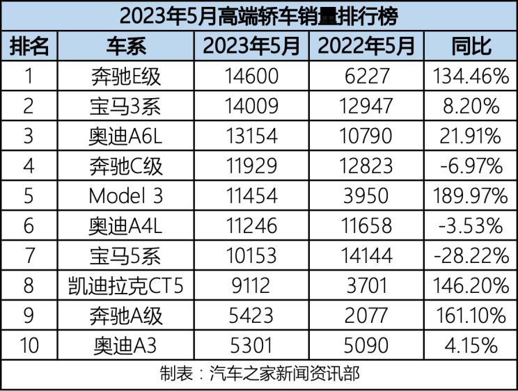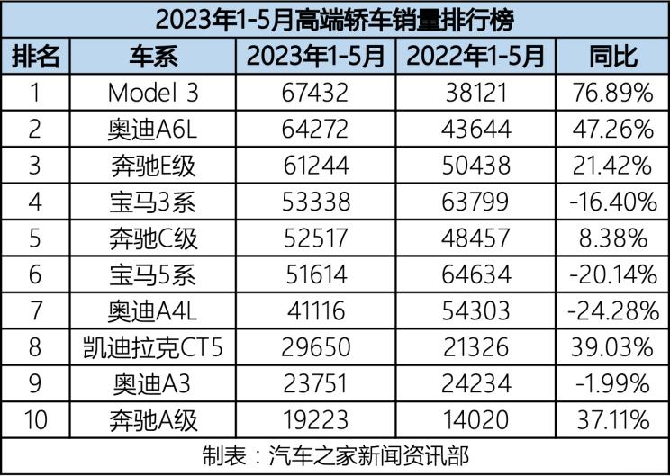 豪华轿车方面,前七名基本没有悬念,依旧是被特斯拉Model 3以及BBA的产品所垄断,虽然稳居前10位置,不过宝马5系单月销量以及1-5月累计销量均有比较大的同比下降,在全新一代宝马5系上市前夕,如何稳住现款5系的市场地位还是需要宝马注意的。另外,凯迪拉克CT5、奔驰A级以及奥迪A3均在5月表现出色,尤其A级销量大幅提升,还是令人比较意外的。(数据来源:乘联会;文/本站 郭辰)