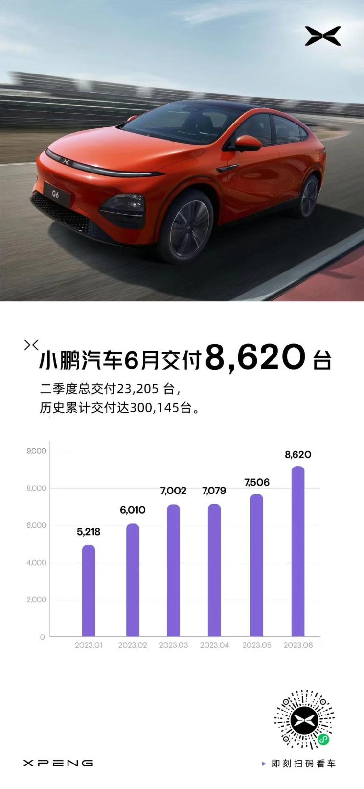 [本站 资讯] 小鹏汽车公布了2023年6月的销量数据,共交付8620台新车,环比增长15%。小鹏汽车实现了2023年上半年销量6连涨,二季度新车交付总量达到了23205台,历史累计交付300145台。