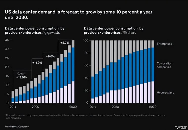 马斯克还预测:“我们将从今天的硅极度短缺变成两年内的电力短缺”。随着争夺AI军备竞赛日趋白热化,对电力的争夺变得越来越重要。根据Digital Information World发布的最新报告,数据中心为训练AI模型产生的能耗将为常规云工作的三倍,预计到2030年,美国数据中心的电力需求将以每年约10%的速度增长。