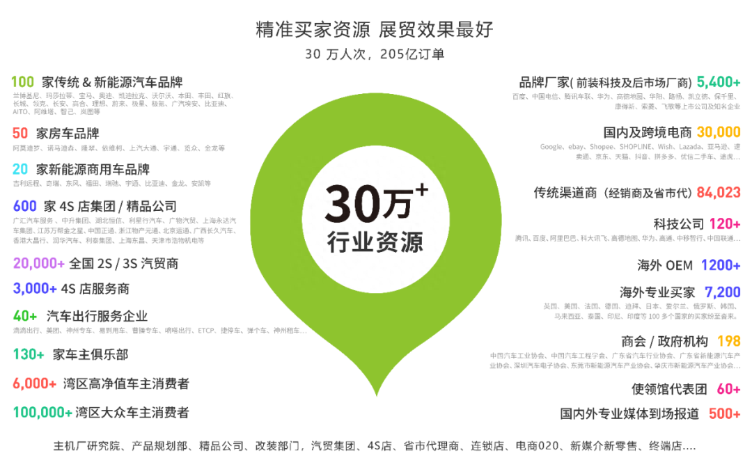 本次展会预计吸引30万+专业优质买家资源,展会在既有优势买家资源上(销售公司、4S 店集团、服务商、省市代、电商及跨境电商、连锁加盟、终端店),向上积极拓展车厂、精品公司等前装客户,向下深化影响车主爱好者等C端消费客户,真正构建起复合型买家群体。
