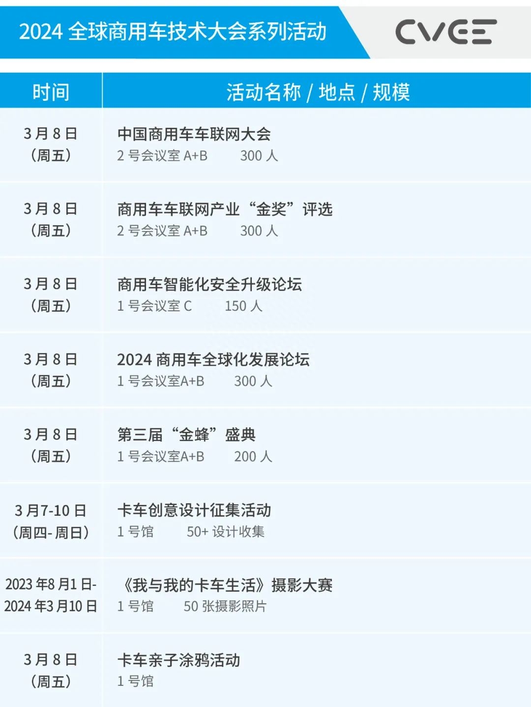 2024年该主题展区从商用车整车、前装科技、车联网、零部件及维保到后装升级服务等,全面展示商用车全产业链各高精尖产品及创新成果,充分彰显中国商用车的实力。展会同期举办7场国际性峰会及赛事活动,成为行业每年度商用车整车、智能驾驶新技术/新产品的全球首发与采购平台。
