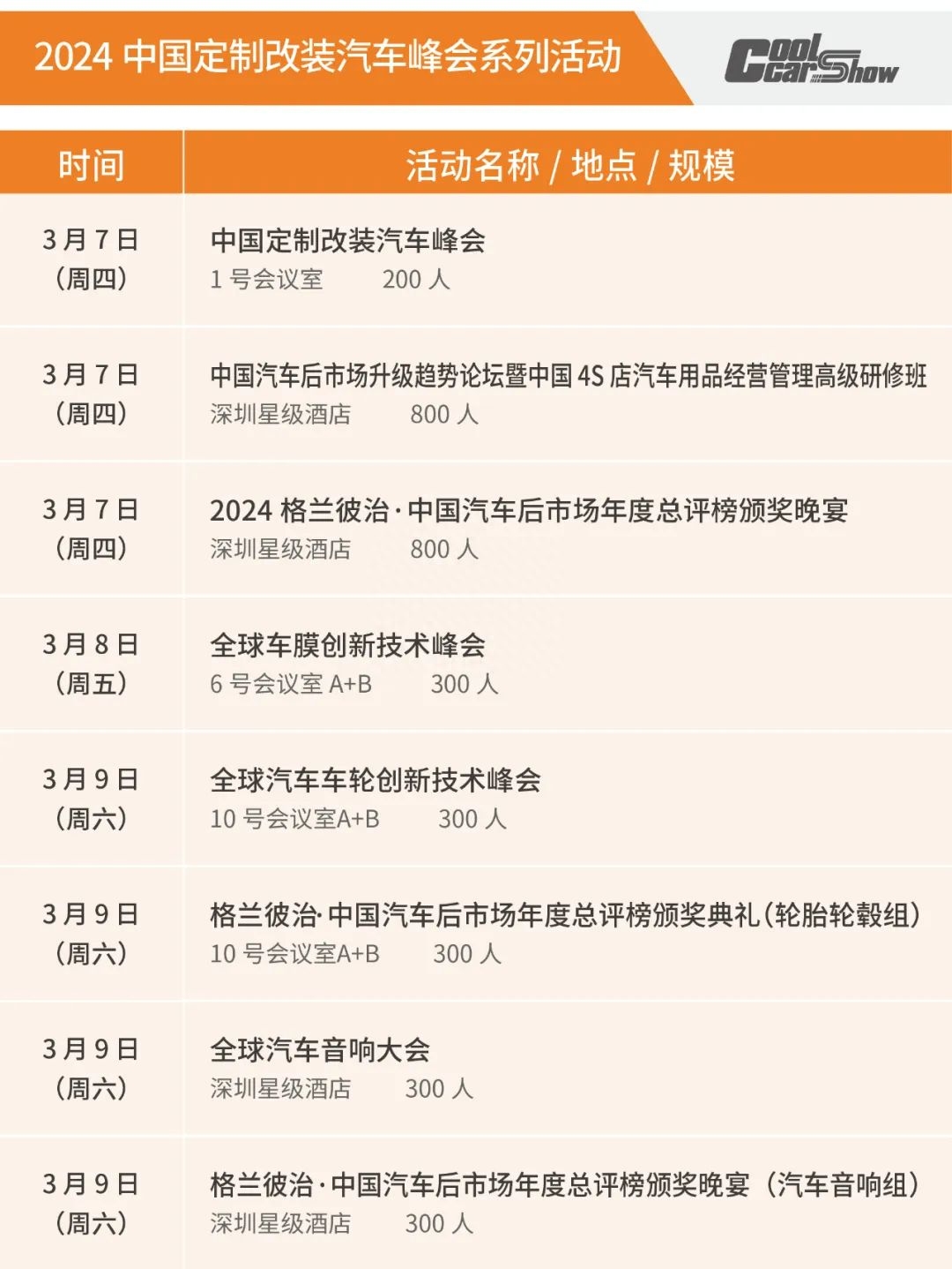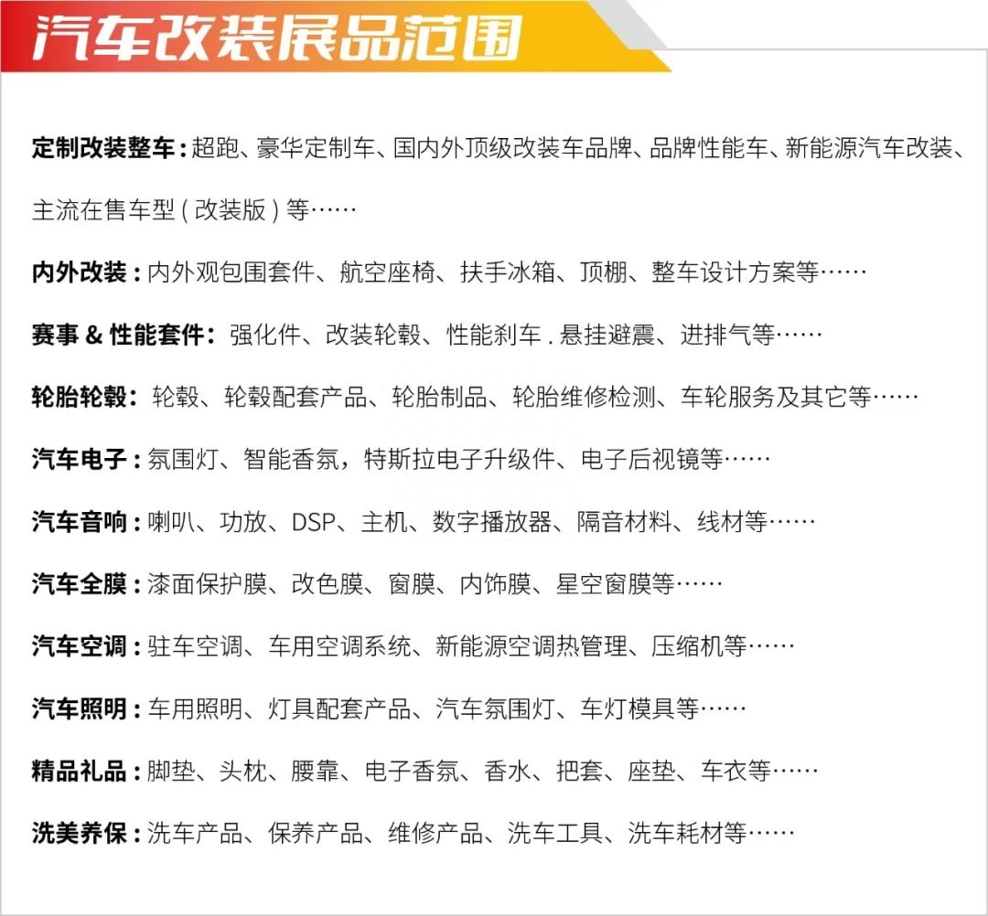 2024年主题展区规模将达24万㎡,全面展现全球年度定制车新车型、汽车改装新产品,充分满足各层次个性消费需求,通过20+场国际性峰会及赛事活动传播汽车改装文化、引领个性消费潮流,成为行业每年度定制改装车新车型、综合改装新技术/新产品的全球首发与采购平台。