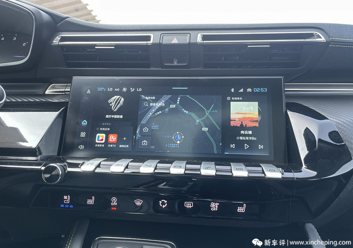 中控屏幕的尺寸不算大、分辨率也不算高,流畅度还是可以的,基本功能和主流APP都有照顾到,车机集成了很多功能,下方还保留了一排的实体按键来辅助驾驶员的操作,实体按键造型类似钢琴键,细节处的精致感有了,但按键只支持“下压”而不支持“上拨”,有时候用起来不够便利,比如说空调控制,按照传统的操作——按键上拨风量/温度增加,按键下压风量/温度降低,但这款车你只能下压按键,在中控屏呼出空调控制界面,再从屏幕中调节空调,步骤就有点多了。