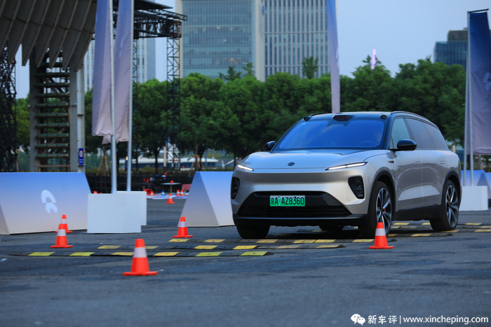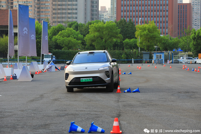 在绕桩体验中,新ES8的在这方面的进步确实让我比较惊喜的。绕桩的时候,车辆模式设置为了舒适,这也是大部分车主常用的行驶模式,尽管这个模式下悬挂状态是偏软的,但是在开始进入第一个桩桶的时候,车身的侧向支撑竟然表现出了还不错的侧向支撑力,这意味着这个悬挂阻尼已经在我开始急打方向的时候,瞬间调整好了悬挂阻尼,帮助驾驶员更从容地驾驶,这点上这个底盘可以说是相当聪明。