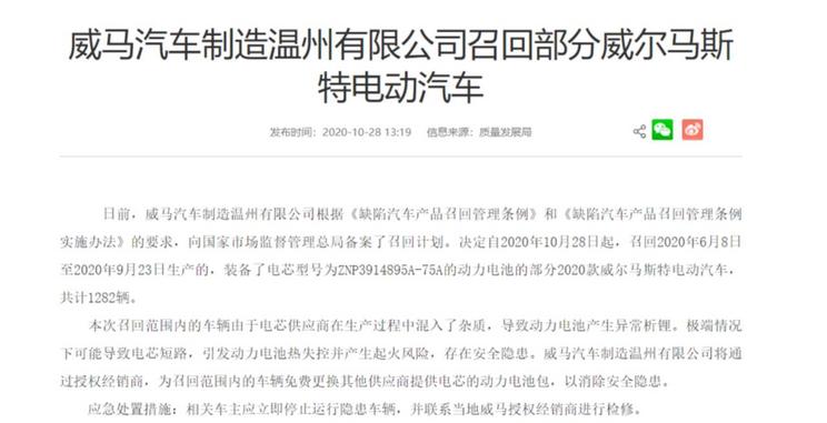 至于召回原因,威马汽车表示,由于电芯供应商在生产过程中混入了杂质,导致动力电池产生异常析锂。威马汽车因这次召回损失1.15亿元。