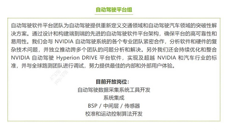 据介绍,英伟达自动驾驶团队的使命是为自动化和自动驾驶车辆设计、创建和部署最安全、最先进的人工智能驱动系统。工作涵盖多种运输形式,从乘用车到商用车再到机器人出租车。从同时训练和测试人工智能的数据中心,到实时进行数据处理的车辆,安全是第一要务。NVIDIA DRIVE 生态系统包括数百家汽车制造商、卡车制造商、班车公司、一级供应商、传感器制造商、软件公司、地图公司和初创公司。